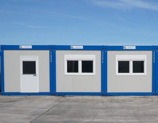 Ensemble de 3 modules préfabriqués totalisant 54 m², idéal pour bureaux, salles de réunion ou espaces fonctionnels, avec isolation performante et équipements complets.