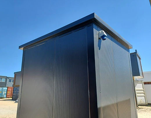 Conteneur sanitaire compact de 2,00 × 2,00 m avec douche, lavabo et réservoir d’eaux usées, entièrement équipé et autonome, idéal pour chantiers, camps et sites temporaires.